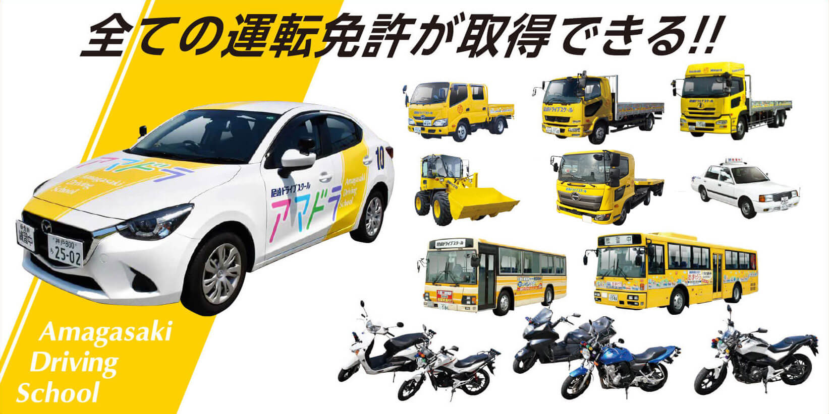 普通免許はもちろん、バイク、トラック、バス、大型特殊、牽引などすべての運転免許が取得可能です。