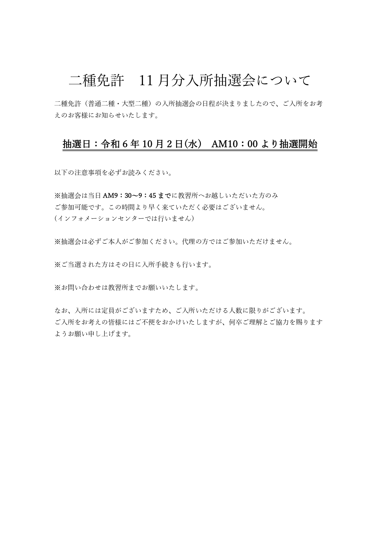 HOME > お知らせ > 11月分 新規二種免許(普通二種・大型二種)入所抽選会のお知らせ